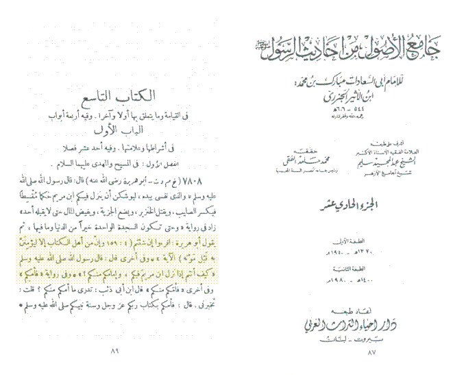 يقول أبو هريرة: أقرءوا إن شتتم (4-159 وإن من أهل الكتاب إلا ليؤمنن به قبل موته) الآية: وفي أخري قال قال رسول الله صلي الله عليه وسلم: كيف انتم إذا نزل ابن مريم فيكم، وإمامكم منكم؟ وفي رواية فأمكم