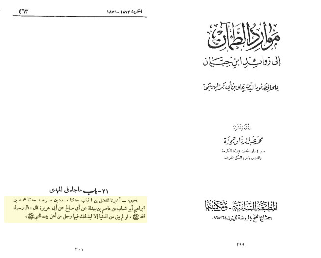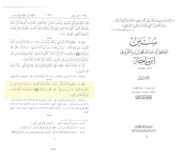 حدثنا عثمان بن ابي شيبة، ثنا أبو داؤد الحفري، ثنا ياسين عن إبراهيم بن محمد بن الحنفية، عن أبيه، عن علي، قال رسول الله صلي الله عليه و سلم: المهدي منا، أهل البيت، بصلحه الله في ليلة
