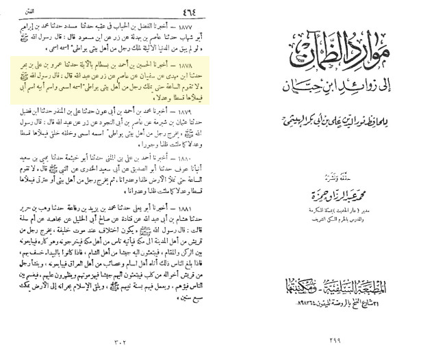 ثنا محمد بن بشار ثنا ابن عدي عن عوف ثنا ابو الصديق الناجي عن ابي سعيد الخدري رضي الله عنه قال قال رسول الله صلي الله عليه وآله وسلم لا تقوم الساعة حتي تملأ الارض ظلما وجورا وعدوانا ثم يخرج من أهل بيتي من يملأ قسطا وعدلا كما ملئت ظلما وعدوانا. هذا حديث صحيح علي شرط الشيخين ولم بخرجاه والحديث المفر بذلك الطريق