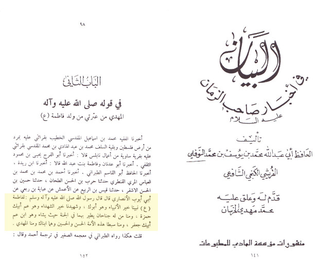 أبي أيوب الأنصاري قال قال رسول الله صلي الله عليه وسلم يقول: لفاطمة (ع) نبينا خير الأنبياء وهو أبوك، وشهيدنا خير الشهداء وهو عم ابيك حمزة، ومنا من له جناحان يطير بهما في الجنة حيث يشاء وهو اين عم أبيك جعفر، ومنا سبكا هذه الأمة الحسن والحسين وهما ابناك ومنا المهدي