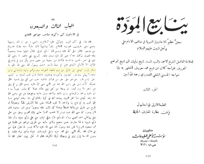 Holy Prophet (pbuh) said, Ya Fatemah! I am the last of prophet and the best of creation in front of Allah .From Wasi best of wasi and most beloved one of Allah is your husband and our martyr is the best of all martyr and beloved of Allah and he is Hamza ibne Abdul Muttalib, the uncle of your father and uncle of your husband. And from us is the one who is bestowed with two wings with which he fly wherever he wills with the angels in the Jannat and he is the son of the uncle of your father and brother of your husband and from is the chief (son, sibte) of this Ummat and they are your sons, Hasan and Husain and they are the chief of the youth of Paradise and their father is better than both of them. Ya Fatemah, by the one who raised me surely from them is the Mahdi for this Ummat.